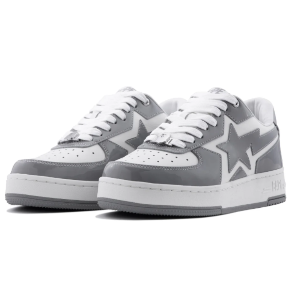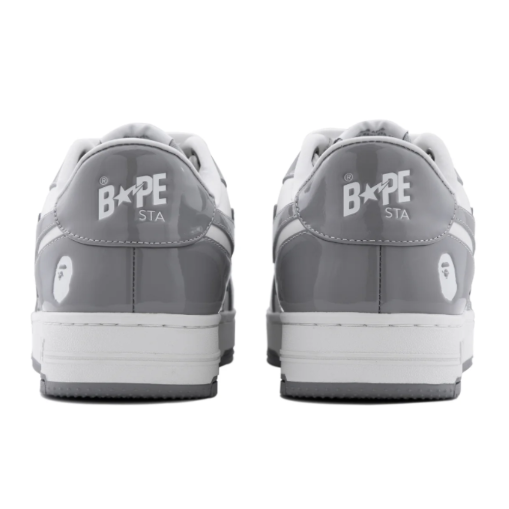 O cabedal em couro premium apresenta uma base grey sofisticada, contrastada por detalhes em branco, formando uma combinação clean e versátil que se adapta facilmente a diferentes estilos. O destaque fica por conta do icônico logo STA em forma de estrela nas laterais, elemento que se tornou símbolo da identidade da BAPE no universo sneaker.