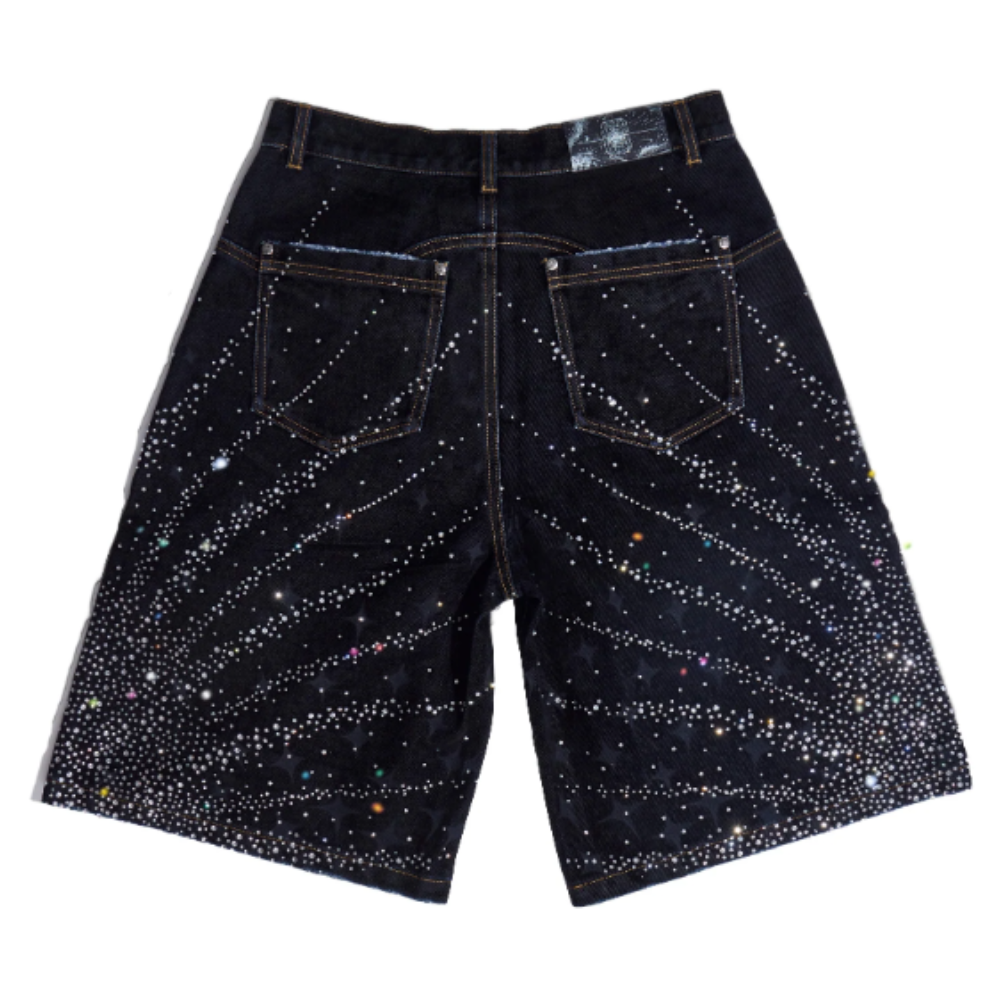 - Design Exclusivo: O grande destaque da peça são os apliques de strass ou cristais (rhinestones/crystal stud details) distribuídos por toda a superfície da bermuda. São milhares de cristais de tamanhos variados que capturam a luz de forma deslumbrante, criando um efeito de brilho intenso que lembra um céu estrelado.