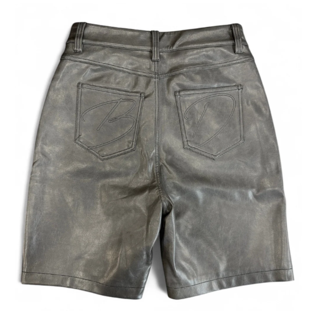 - Estilo Versátil: Com tonalidade cinza metálica/grafite, este “jort” (jeans shorts) de couro se adapta perfeitamente a composições Y2K, hip-hop ou luxo casual.