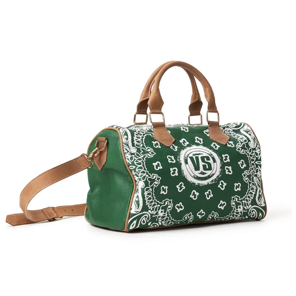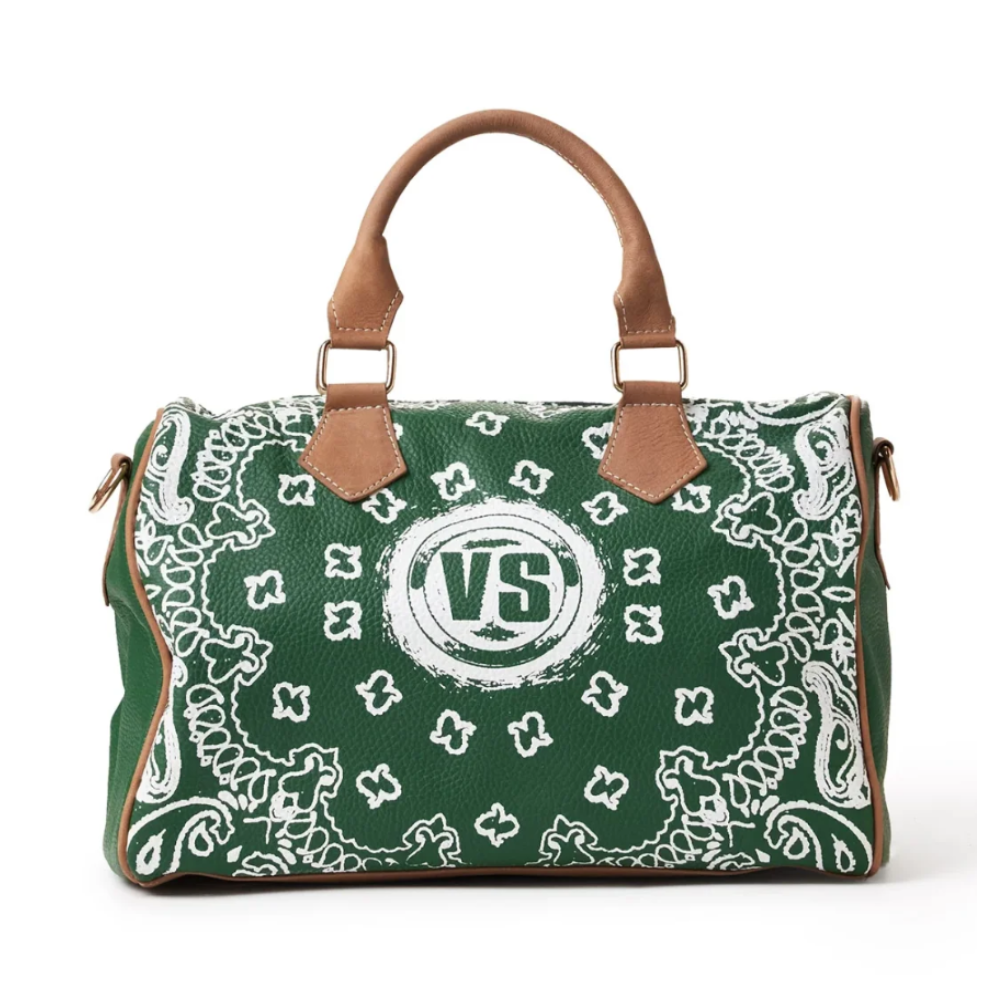 Bolsa Valley Pine Flag Duffle confeccionada em couro sintético verde com acabamento texturizado e detalhes em marrom caramelo.