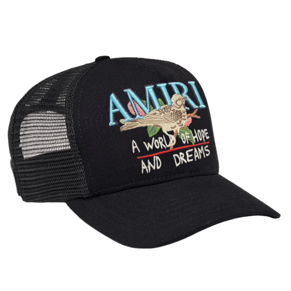 O design é definido por um painel frontal estruturado em lona de algodão preta, servindo de tela para o logotipo “AMIRI” em azul claro, acompanhado por uma ilustração detalhada de um pássaro sobre ramos florais e o slogan “A World of Hope and Dreams”.