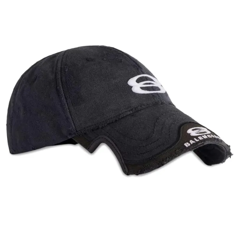 Este é o Boné Balenciaga Double Unity Distressed, uma peça de luxo que define o estilo streetwear contemporâneo da grife francesa.
