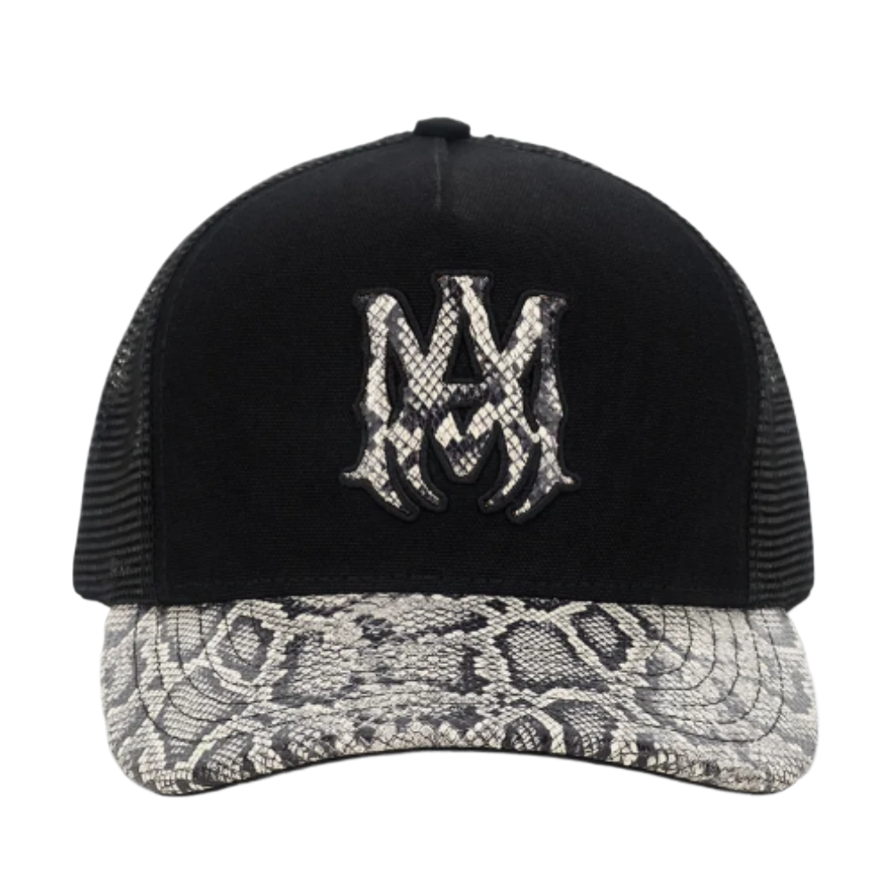 O grande diferencial deste boné está no seu design texturizado: a aba curva apresenta uma aplicação luxuosa de couro com estampa de cobra (snake print) em tons de cinza e preto, que se repete no aplique do logo “MA” bordado em relevo no painel frontal.
