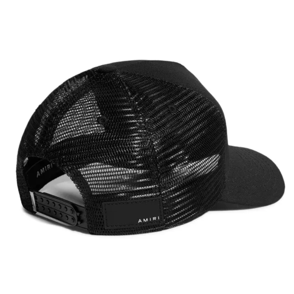 Este boné trucker icônico da grife de luxo Amiri é um acessório essencial do streetwear que combina o estilo clássico de caminhoneiro com a estética ousada e urbana da marca de Los Angeles.