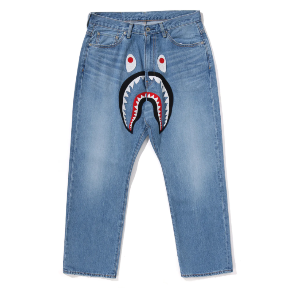 Esta calça jeans de modelagem solta BAPE Shark Loose Fit 13 Oz Denim Pants (calça jeans de ajuste solto Tubarão 13 Oz) é uma peça de vestuário streetwear icônica e altamente cobiçada da marca japonesa A Bathing Ape (BAPE).