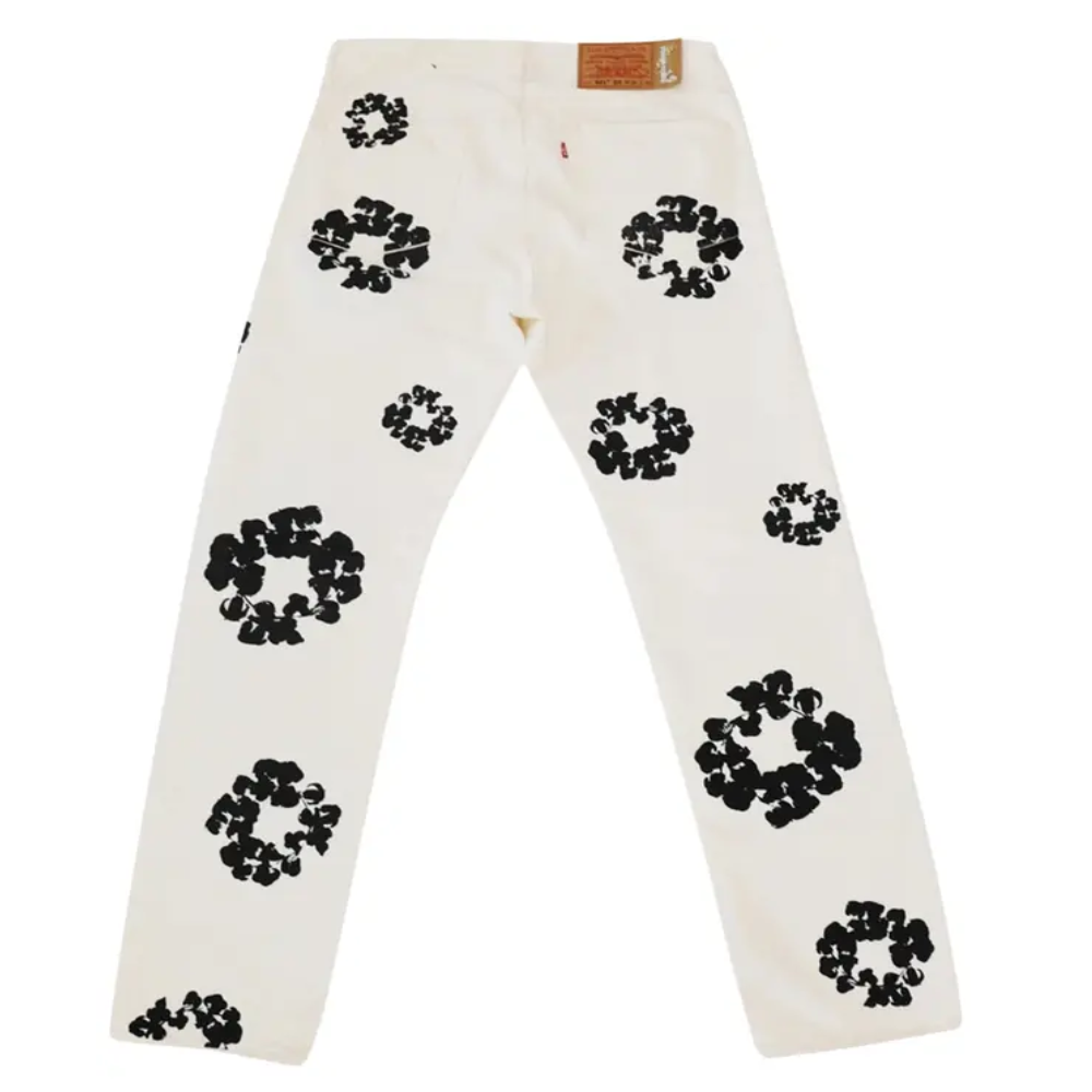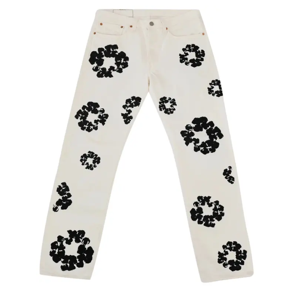 - Padrão “Cotton Wreath”: Apresenta diversas coroas de flores de algodão aplicadas em serigrafia de alta densidade (puff print) por toda a extensão da calça, criando um relevo tátil e visual impactante.