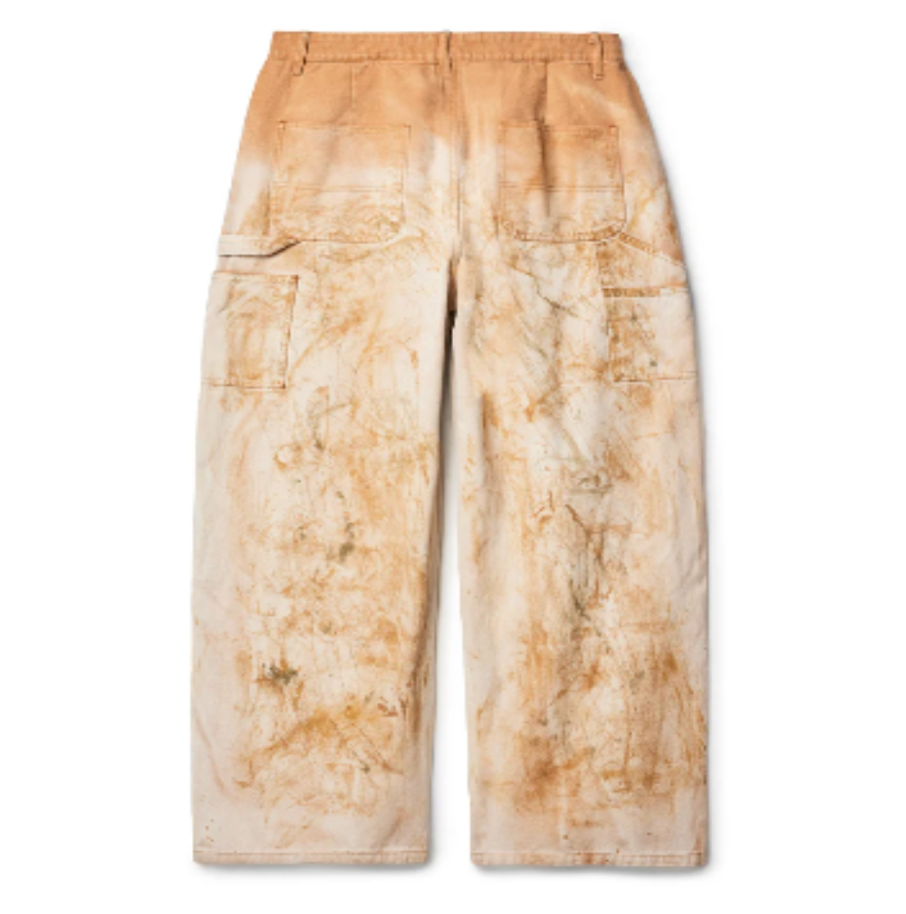• Efeito Desgastado: A calça possui um tratamento de lavagem que confere um aspecto vintage e sujo (dirty washed), com áreas de desbotamento e marmorização propositais em tons de bege e marrom.