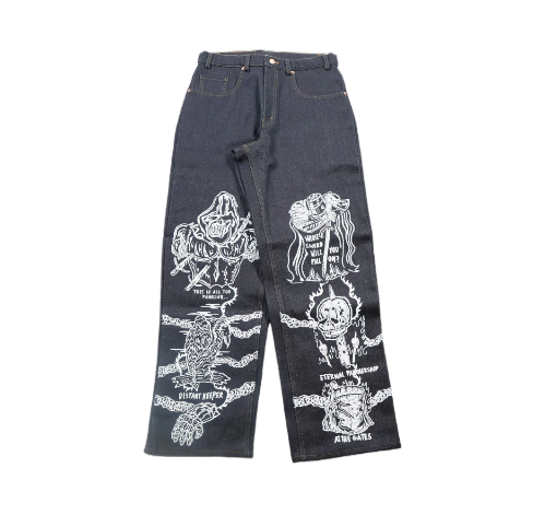 Ele apresenta gráficos serigrafados em branco nas pernas, com ilustrações de caveiras, um ceifador e textos como “ETERNAL PUNISHMENT” e “DISTANT KEEPER”.