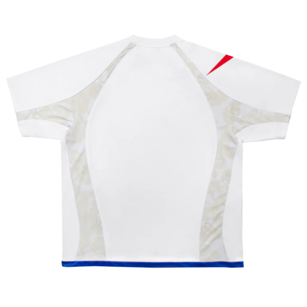 - Escudo Customizado: No peito, apresenta um escudo que reinterpreta o emblema da seleção da Inglaterra, incorporando o nome “BATHING APE” e três cabeças de macaco (Ape Heads) no lugar dos tradicionais leões.