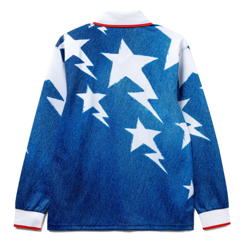 • Inspiração Retrô: O visual é diretamente inspirado nas camisas de futebol da Seleção dos Estados Unidos de 1994, conhecidas pela icônica estampa de estrelas.