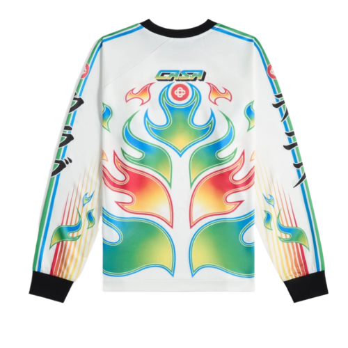 Esta peça de luxo da marca parisiense Casablanca combina a estética esportiva de uma camisa de futebol com um design gráfico ousado, inspirada na subcultura japonesa Bōsōzoku.