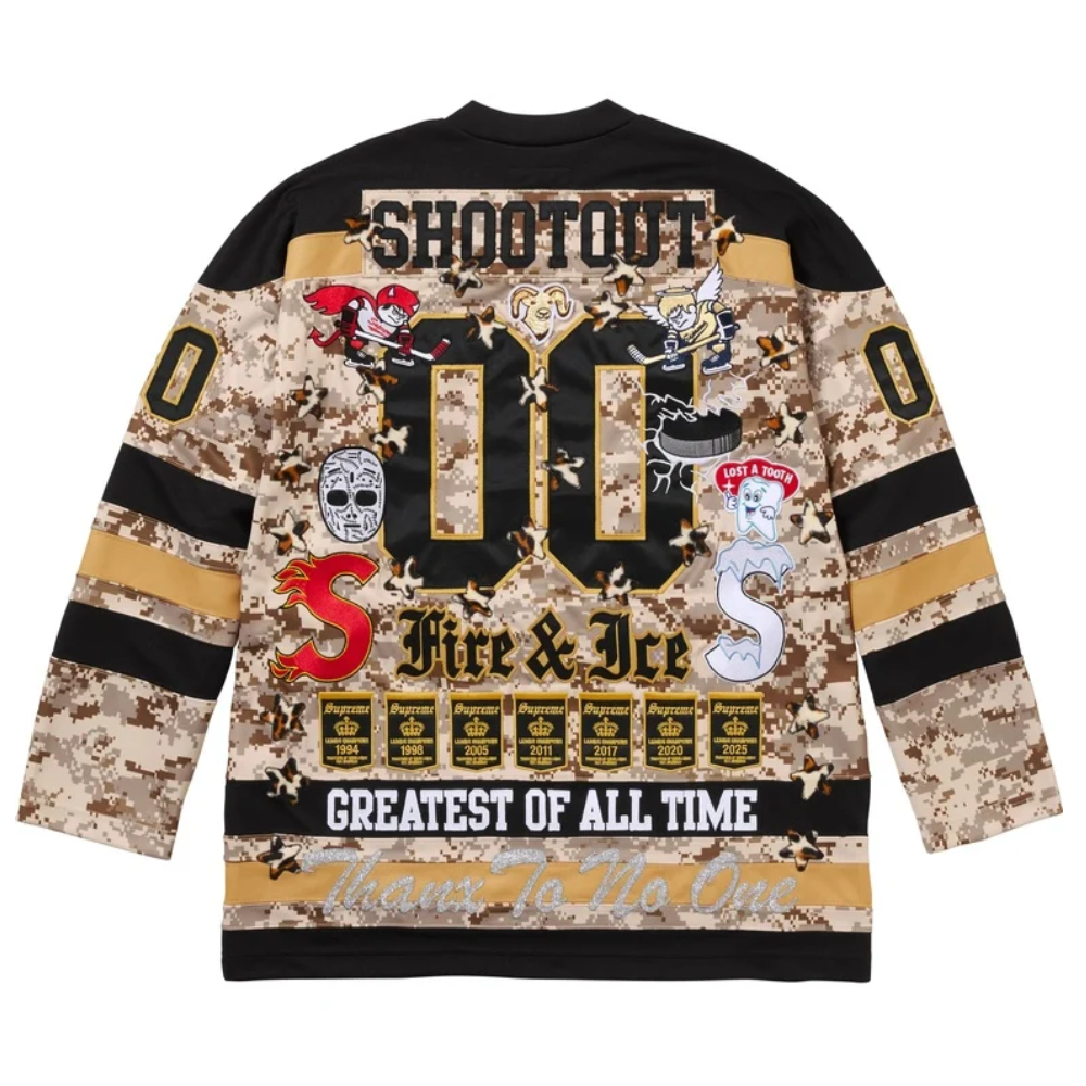 Domine as ruas com a Jersey Supreme Fire & Ice Hockey, uma peça que funde a estética robusta do hóquei no gelo com o design tático urbano.