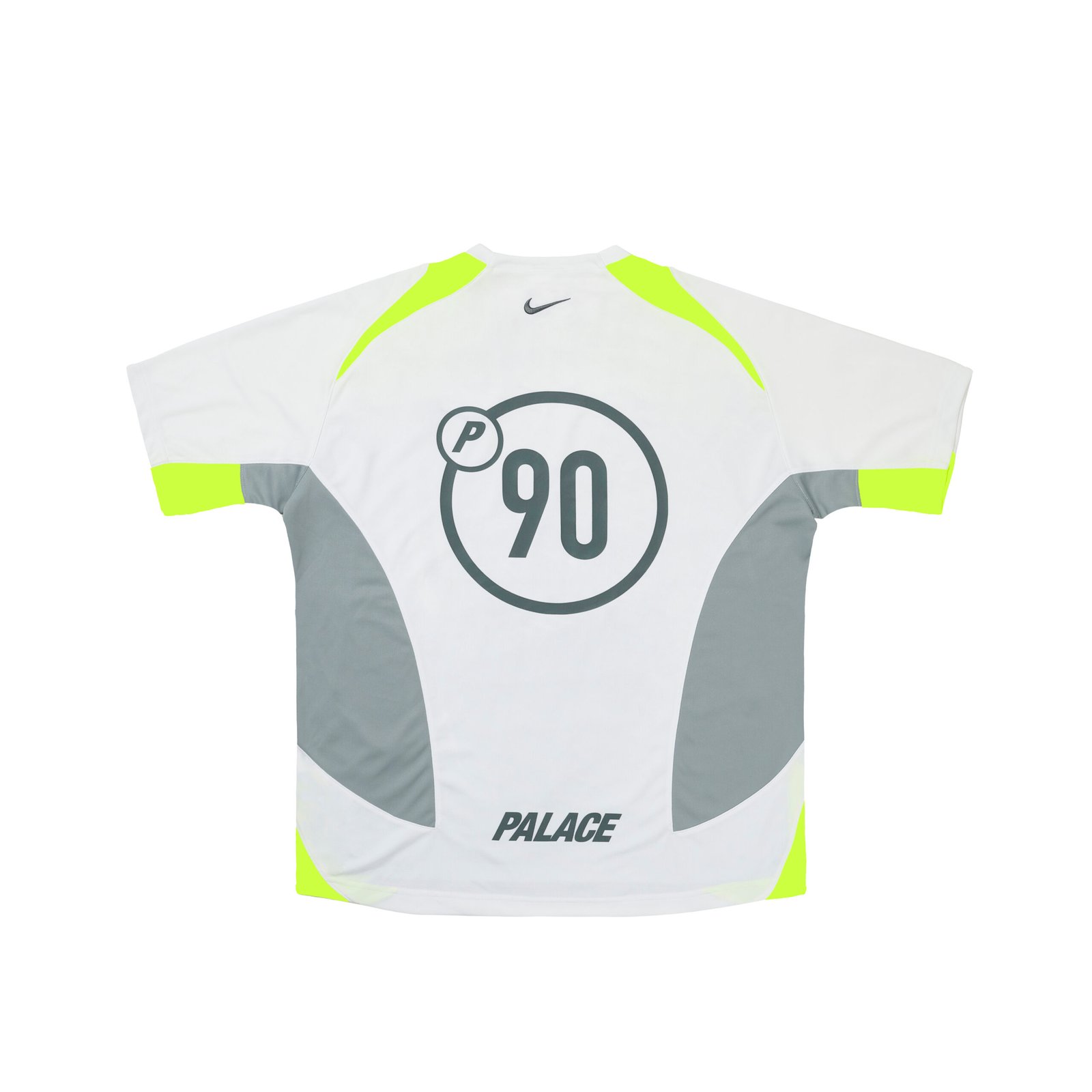 O logo “PALACE” e o Swoosh da Nike estão presentes em ambas as peças, enquanto a camiseta exibe o distintivo circular “90” no peito, reforçando a identidade da coleção.