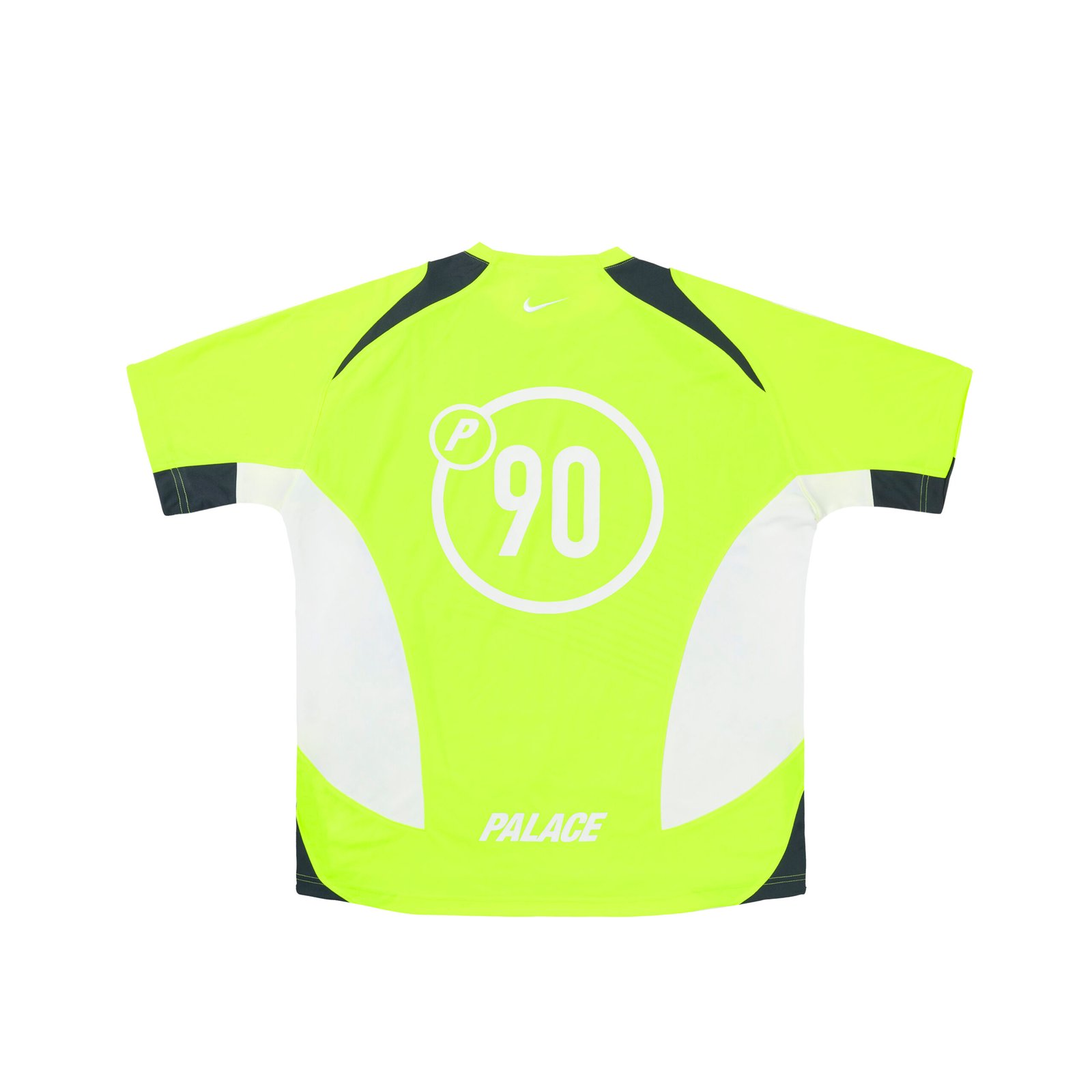 O logo “PALACE” e o Swoosh da Nike estão presentes em ambas as peças, enquanto a camiseta exibe o distintivo circular “90” no peito, reforçando a identidade da coleção.