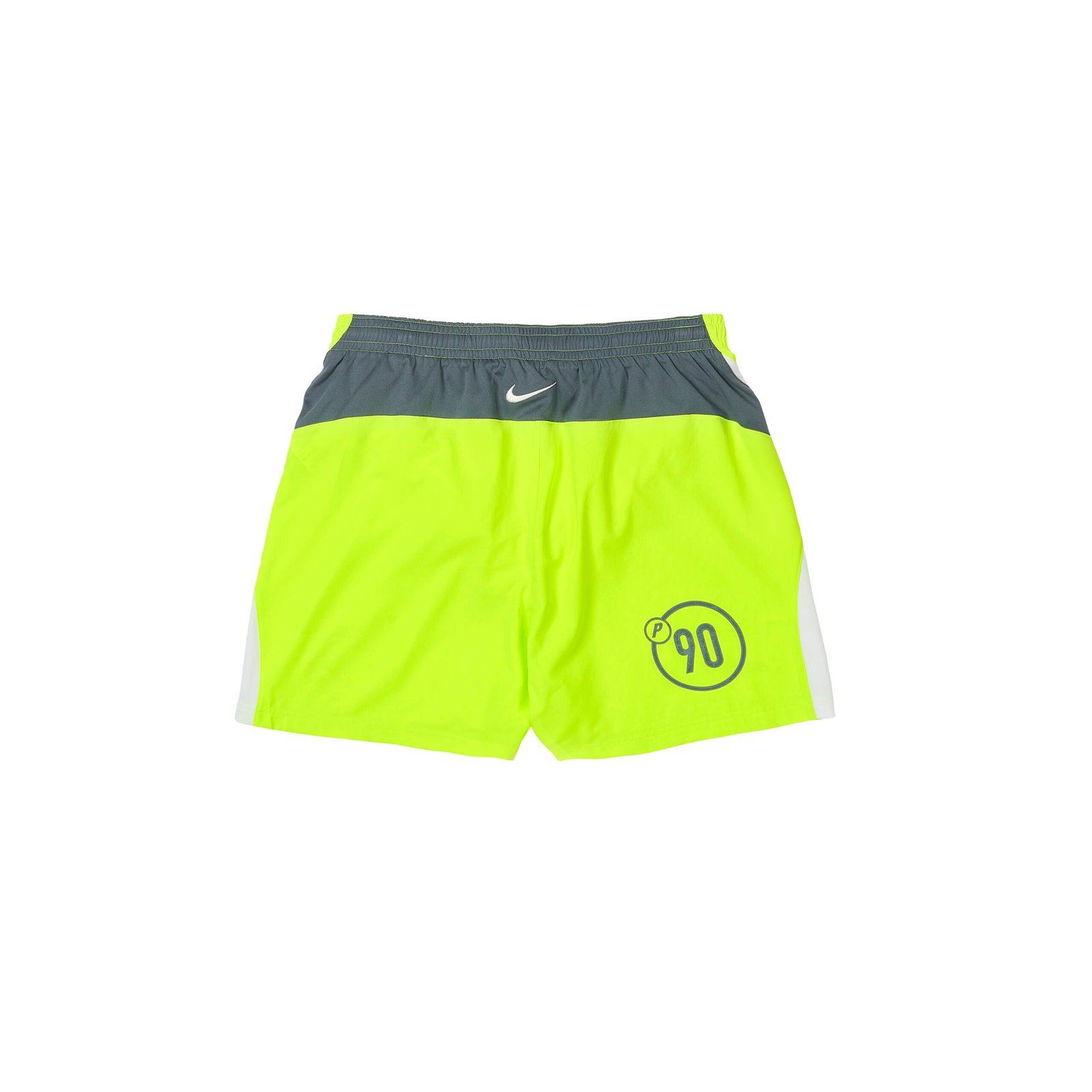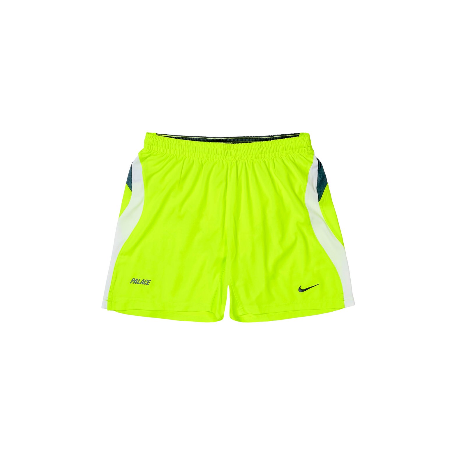 - Design dos shorts: Painéis gráficos nas laterais, logos “PALACE” e Swoosh, cintura com cordão elástico.