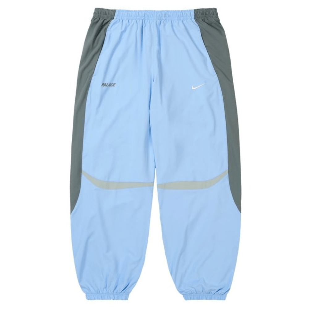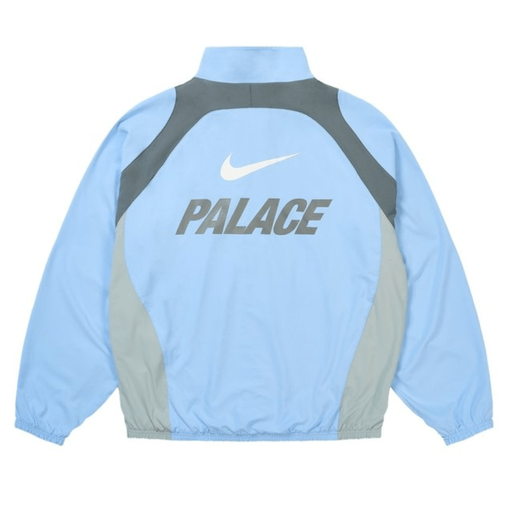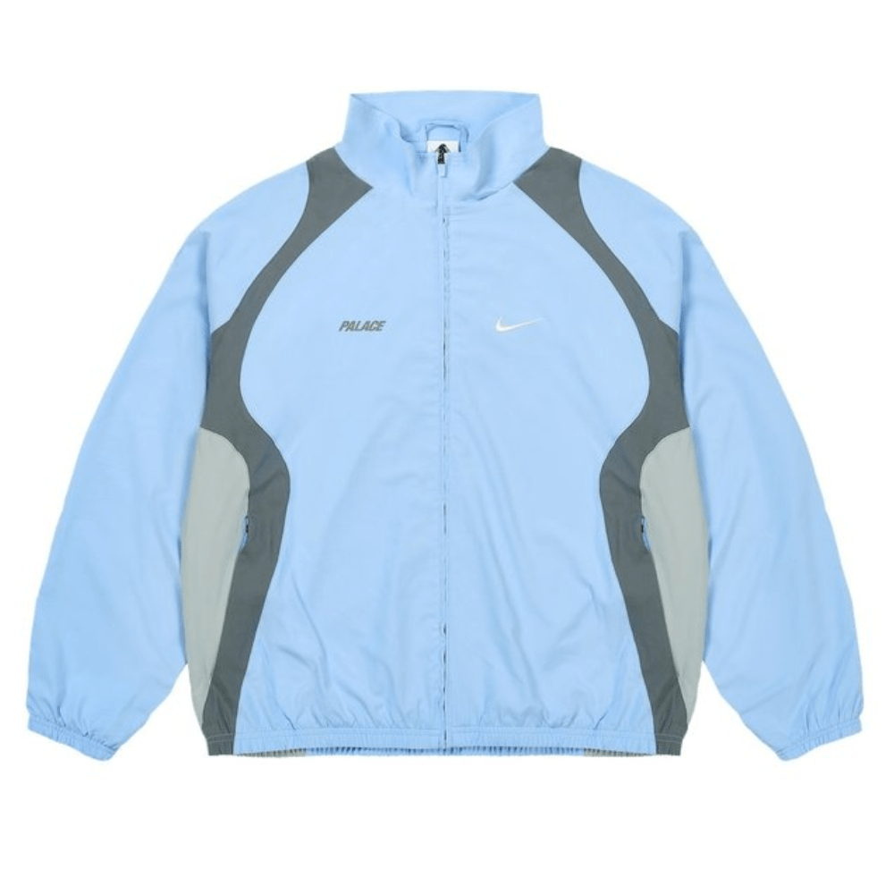 • A Jaqueta (Track Jacket): Possui gola alta estruturada e fechamento em zíper selado. O design apresenta recortes anatômicos em cinza e azul escuro que acompanham o movimento do corpo, garantindo uma silhueta imponente. O logotipo PALACE e o Swoosh da Nike são aplicados com precisão no peito, mantendo uma estética limpa, equilibrada e luxuosa.