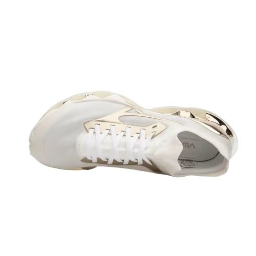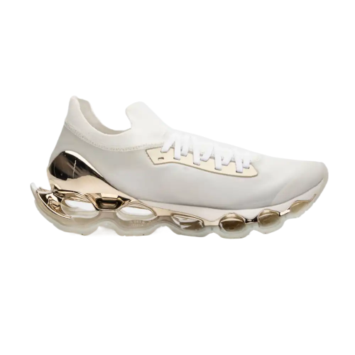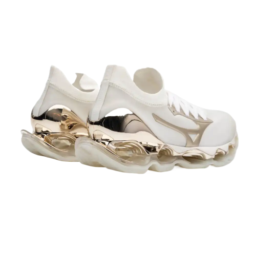 O Hajime Sorayama x Mizuno Wave Prophecy 10 Gold combina a visão artística do renomado designer japonês Hajime Sorayama, conhecido por suas esculturas metálicas e estética futurista, com a inovação tecnológica da Mizuno. O resultado é uma obra de arte funcional, que transcende o conceito tradicional de sneaker.