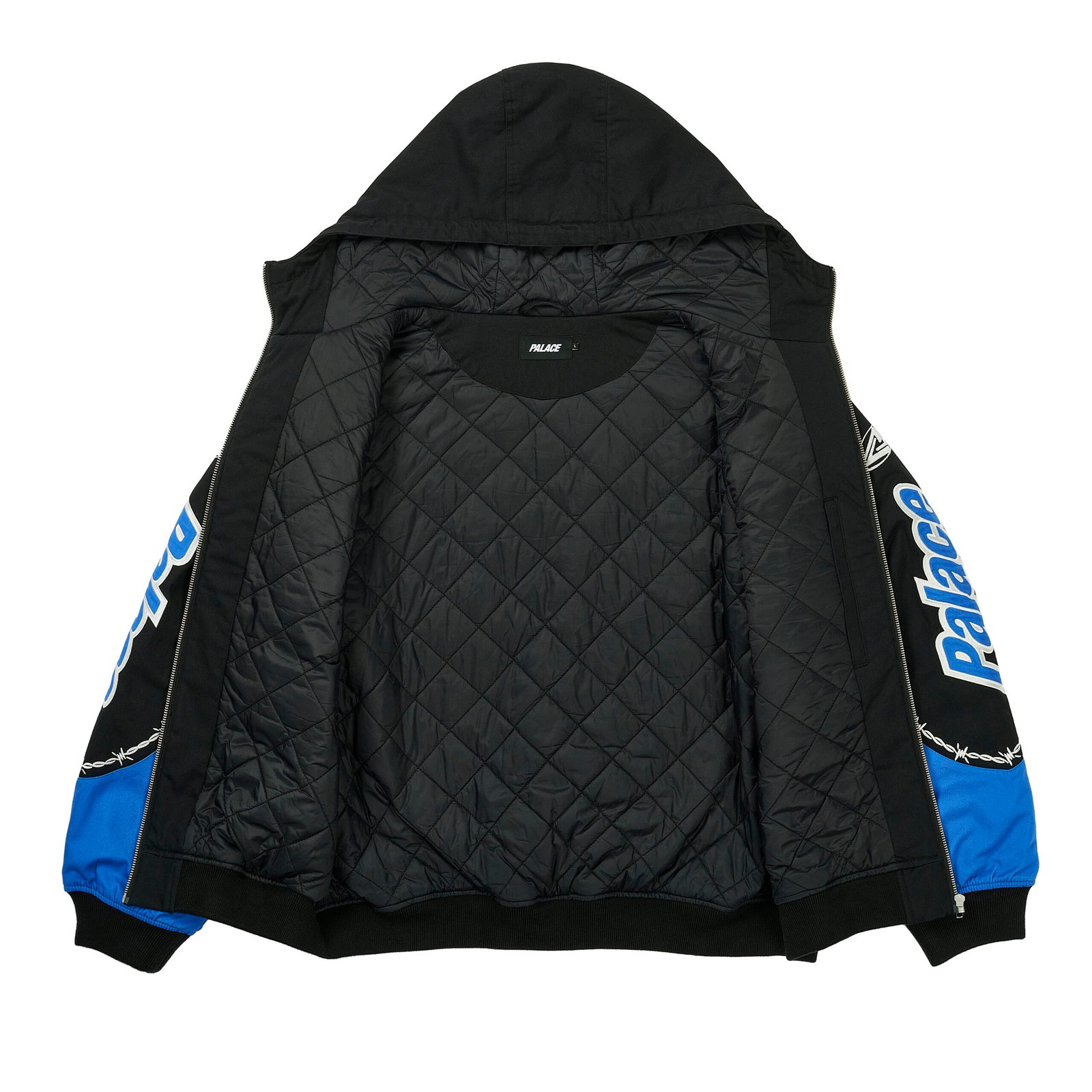O design inclui um gráfico de arame farpado em branco que percorre o centro e as mangas da jaqueta, adicionando um elemento de estilo distinto.