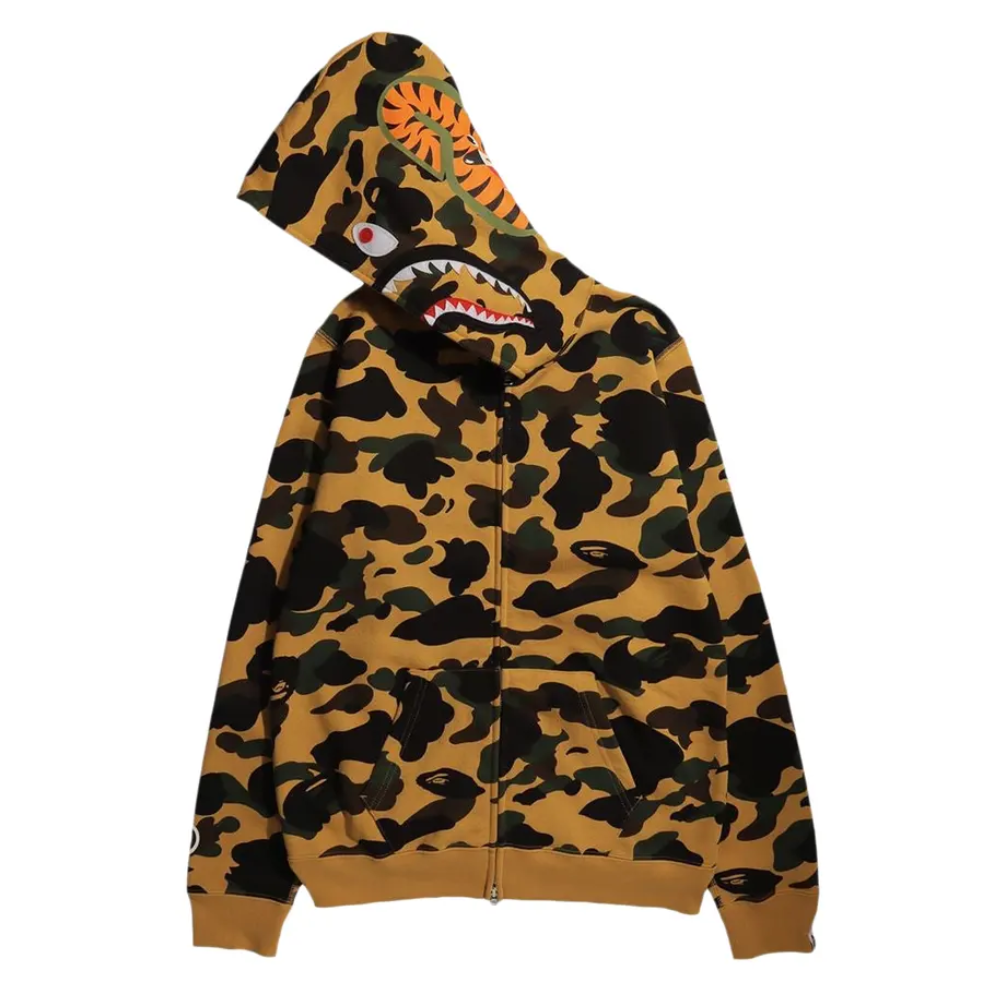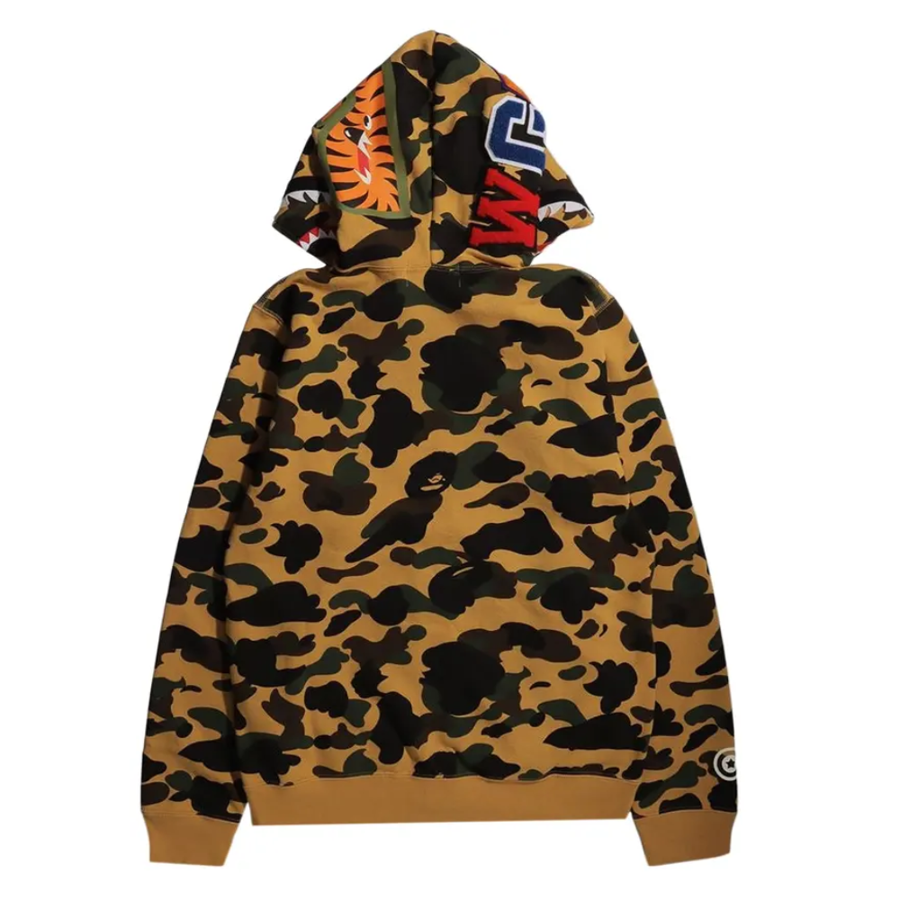 - Padrão 1st Camo: Estampa de camuflagem clássica da BAPE em tons de amarelo mostarda e verde oliva.