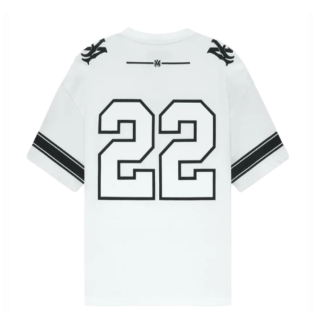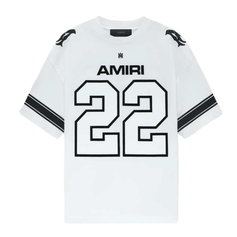 - Estética Varsity & Skate: Design inspirado em camisas de hóquei e skate retrô, apresentando o número “22” em estilo bloco e o logotipo AMIRI em destaque no peito.
